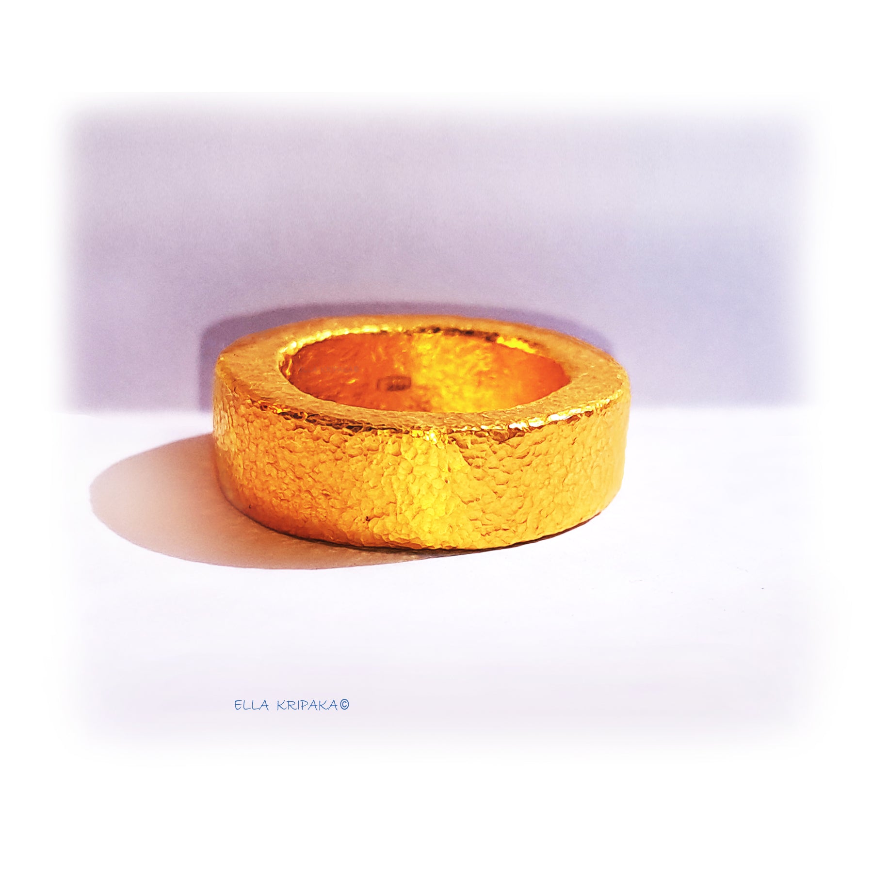 Hammered Ancient Rome gold ring is Made-to-Order in solid 24k 9999 gold. I create my design of jewelry with pictures on paper. I use 100% handmade jewelry technology as in Ancient Empires: my art forging with a few hammers, manual cutting & sawing, and manual welding for gold. I connect parts with small pieces of 9999 gold and hot flame: it is art from Ancient Empires. I never use 22k gold solders for 24k gold jewelry, but many other jewelers usually use 22k gold solders in their 24k gold jewelry. The wonderful ring is hand-polished by me and sparkles a lot on hammered art textures of pure 24k gold. Each gold ring is created uniquely & without copies with jewelry machines. I do not use electrical jewelry tools. I make the biggest hardness of 24k gold for the durable gold ring: it is long creative work. Hammered art textures of 24k gold are excellent for a long-time wearing.
