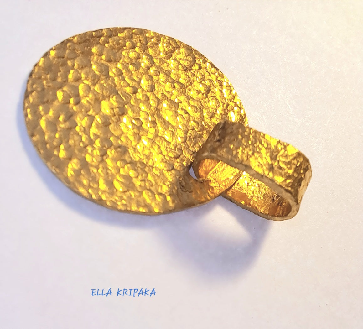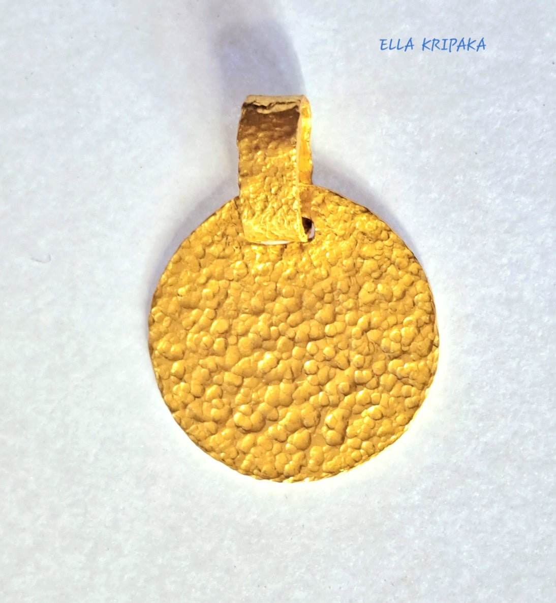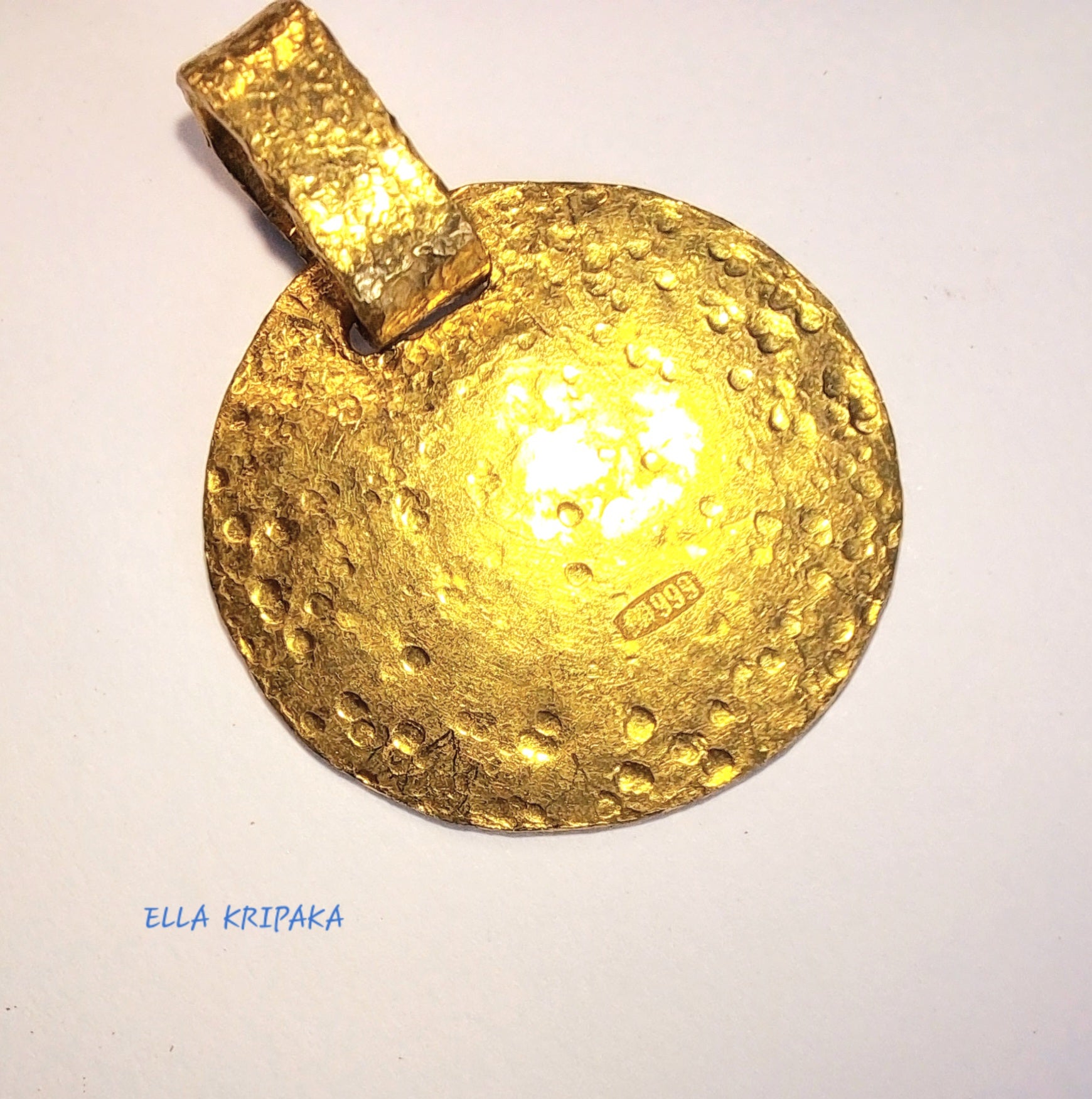 Hammered Disk Pendant is Made-to-Order in solid 24k 9999 gold. I create my jewelry design with pictures on paper. I use 100% handmade jewelry technology as in Ancient Empires: my art forging with a few hammers, manual cutting and sawing, and manual welding for gold. I connect parts with small pieces of 9999 gold and hot flame: it is art from Ancient Empires. I never use 22k gold solders for 24k gold jewelry, but many other jewelers usually use 22k gold solders in their 24k gold jewelry. The wonderful pendant is hand-polished by me and sparkles a lot on hammered art textures of pure 24k gold. Each gold pendant is created uniquely and without copies with jewelry machines. I do not use electrical jewelry tools. I make the biggest hardness of 24k gold for the durable gold pendant: it is long creative work. Hammered art textures of 24k gold are excellent for a long-time wearing.